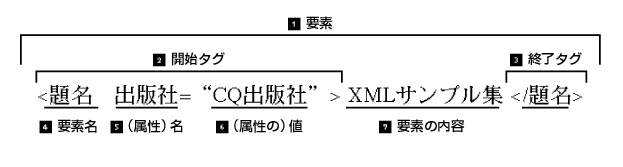 (1)XML文書であることを宣言する まず,1行目には,いま制作しているファイルが,XMLであることを明記します.XML文書の宣言を書くわけです.versionには,XML規格のバージョンを指定します.現在のバージョンは1.0ですので,xml version="1.0" のように書きます.注:2 (2)文字コードを指定する XML文書の宣言に続けて,XML文書の文字コードを指定します。encoding="文字コード"のように書きます.文字コードには,仕様で勧められている「Unicode(UTF-8またはUTF-16)」や,Windows環境では一般的な「Shift_JIS」があります.Windows95,98版のメモ帳は,Unicodeをサポートしておらず,Shift_JISで保存されるため,本書のサンプルではShift_JISを指定しています. XMLの基本の用語 XMLの解説を読むうえで必要な用語を,7個だけ記憶にとどめてください(図1).
