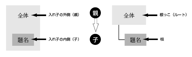 要素には属性を持たせることができます. <題名 出版社="CQ出版社">XMLサンプル集</題名>といったタグ付けをした場合,「出版社」は属性名,「CQ出版社」はその値です. (3)XML文書には,一つのルート要素を書く XML文書の各々の要素は,HTMLと同様,入れ子になっています. リスト1は,要素「全体」の中に,要素「題名」があるという構造になっています。この場合,入れ子の内側の箱から外側の箱を見ると,外側が親になります.逆に,外側の箱から内側の箱を見ると子になります.つまり,お母さんのお腹に赤ちゃんがいるような関係です.入れ子の関係では,相対的な親子関係が成り立つわけです. この親子関係は,ツリー(tree=木構造)でも表現できます(図2).注:3木に根っこ(=root)があるように,XML文書のソースにも必ず根っこ(一つのルート要素)が必要です.リスト1のXML文書では,<全体></全体>がルート要素です.
