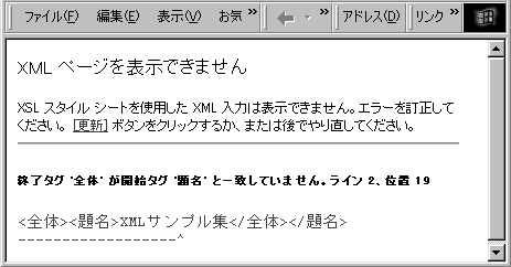 (4)全ての要素は正しく入れ子にする XML文書の各々の要素を,きちんと入れ子にする必要があります.たとえば,リスト1で,親子関係を無視して,<全体><題名>XMLサンプル集</全体></題名>などと誤って書くと,ブラウザはエラーを返します(図3).