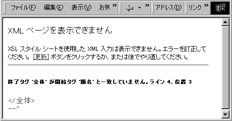 (5)すべての要素には,終了タグを書く XMLの場合は,HTMLと異なり,必ず終了タグを書く必要があります. たとえば,リスト1で</題名>という終了タグを書かなければ,ブラウザは,エラーメッセージを返します(図4).