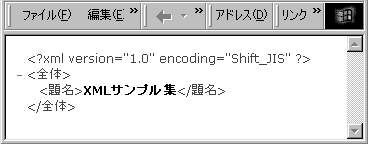 (6)指定した文字コードで保存する リスト1(「XMLサンプル集」という文字列を内容とするXML文書)を,任意のファイル名,たとえばtest.xmlといった名前で保存してください.XML文書の拡張子は,.xmlです. XML文書の文字コードにShift_JISを指定していますので,Windows95,98版のメモ帳では,そのまま保存してください.注:4 (7)属性値は,二重引用符で挟む XMLの要素には,属性を持たせることができます。<題名 出版社="CQ出版社">XMLサンプル集</題名>では,要素名(ここでは「題名」)と属性名(ここでは「出版社」)の間は,半角スペースを空けます.XMLでは,属性値(ここでは「CQ出版社」)は,必ず二重引用符で囲まなければなりません. (8)大文字,小文字を区別する タグには,日本語だけでなく,英字を使ってもよいのですが,HTMLと異なり,XML文書では,大文字・小文字の区別が重要です.大文字・小文字を書き分ける習慣を付けておきましょう. では,作成したXML文書をIE5.01で開いてみます.XML文書を開くと,ソースのツリーが表示されます(図5).