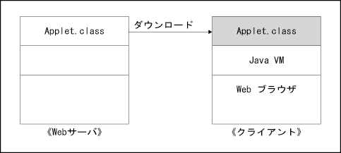 1.1 動的なWebコンテンツ技術 JSPが出現する前に利用されていた動的なWebコンテンツ技術には,クライアントで実行するものと,サーバで実行するものとがありました.クライアントで実行する技術は,Javaアプレット,プラグイン,ECMAScript(JavaScript,VBScript,JScript)などであり,サーバで実行する技術は, CGIアプリケーション,サーバサイドJavaScript,Javaサーブレット, ASP(Active Server Pages)などです.JSPについて説明する前に,これらの代表的なものについて整理しておきます. (1)Javaアプレット Javaは,サン・マイクロシステムズによって開発されたWebで動作することを考慮したプログラミング言語です.Javaアプレット(Javaコンパイラによって生成されたプログラムモジュールで.classという拡張子を持つ)は,HTMLページによってブラウザに読み込まれ,ブラウザに組み込まれたJava VM(インタプリタ)によって実行されます. 以下のように,HTMLファイルにappletタグで指定したアプレット(.classファイル)が,ダウンロードされ,paramタグによってデータを与えます(図1.1).