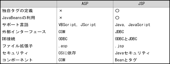 以上,代表的な動的なWebコンテンツ技術について述べました.このように,JavaアプレットやJavaScriptによる方法は,クライアントにアプリケーション(アプレットやスクリプト)をそのつどダウンロードするため,転送による遅延が生じ,効率が悪くなります.まさにアプレットという名が示すように,アプレットは小さなプログラムに適しています.一方,CGI,サーバサイドJavaScript,サーブレットは,サーバ側で実行するためアプリケーションをダウンロードするための遅延はなく,サーバリソースに余裕があれば,実行性能には影響はありません.ただし,サーバで実行するプログラムは複雑になりやすいので,プログラムの開発効率や保守効率には,問題があります.ASPとJSPは後述するようにこの問題を解決します. では,ASPとJSPとの違いは何でしょう.JSPの詳細を説明する前に簡単に述べておきます.JSPはマイクロソフトのASP(Active Server Pages)に対抗する技術ととらえられがちですが,その実態は大きく異なります.確かにCGIアプリケーションのようにサーバサイドでアプリケーションを実行するWeb技術の一つという点では似ています.しかし,その背景にある技術は大きく異なります.大きな違いは,Webとの親和性が高いJava技術がベースになっており,EJB(Enterprise JavaBeans),さらにはCORBAといった,システムをスケールアップする技術が背景にそろっていることです.このような技術が背景にあることで,サーバ側にかかる負荷を減らすことができます.これが重要な相違点です.これら以外のASPとJSPの違いについては,表1.1を参照してください.