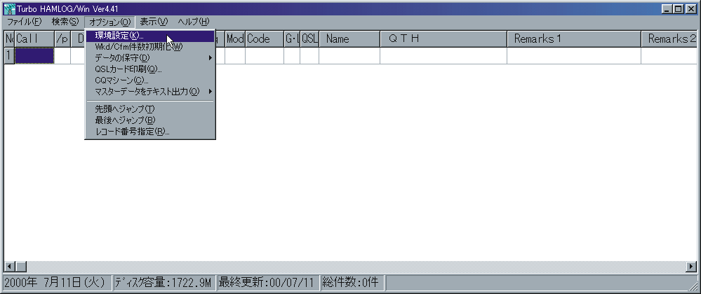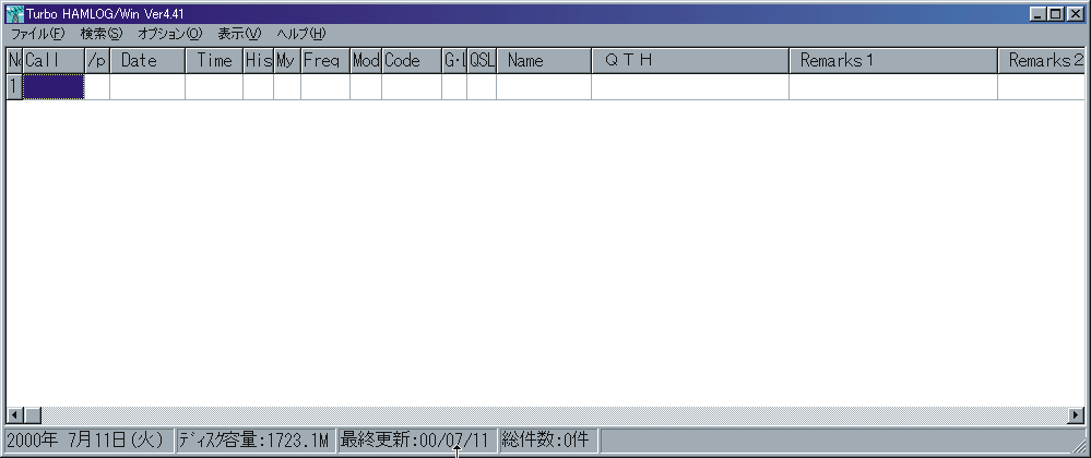 12 これがハムログの起動画面.まだ交信局を入力していないので,真っ白な状態だ.これから自分用のハムログを作っていく.
