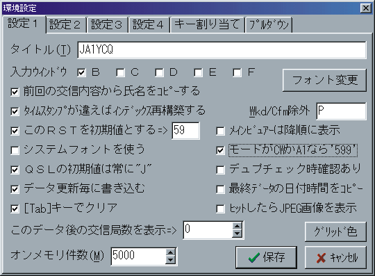 QSOデータのマルチ入力を可能にするもの.B〜Fをチェックすると,入力できる画面が同時に複数になる.複数のパイルアップに参加している場合には有効な機能だ. これがチェックされていれば,氏名の入力を省くために前回の交信データの氏名を入力欄にコピーする.ただし,テキストデータ等にヒットしているか,またはコールサインより先に氏名が手入力されていれば,そちらの内容が優先される. これチェックされていれば,起動時にデータファイルのタイムスタンプを確認し,前回使用したデータと違う場合はインデックスファイルを作り直す.通常はここはチェックしておきましょう. これがチェックされていると,データを登録・クリアすると,常にここで指定した値で初期化される. これがチェックされていれば,固定ピッチのシステムフォント FixedSys を使います.チェックをはずすと,一覧表示される画面のフォントサイズを自由に変更できます.640×480の画面ではフォントを変更し,フォントサイズを小さめにしておいたほうが見やすくなる場合があります. これががチェックされていると,データを登録・クリアすると,QSLの項目の一文字目は常にJ(Via JARL)になる.チェックされていない場合は,D(ダイレクト),N(ノーQSL),M(QSLマネージャー経由)を入力してもそのままです. これがチェックされていると,1件データを入力や修正する度に確実にディスクに書き込む.これにより,入力中に停電やパソコンがハングアップしても安心.しかし,ディスクキャッシュによりWindowsでは遅延書き込みが行われている場合があるので,絶対に大丈夫というわけではないのでご注意を. メインウインドウ(メインビュアー)のタイトルです.自分のコールサインでも入力しておきましょう. これがチェックされていると,MS-DOS版Turbo HAMLOGと同じようにタブキーで入力バッファのクリアができる. 起動時に,オンメモリ件数で指定した件数分のバッファ(メモリ)が用意され,QSOデータの最後の方の局のデータが指定した件数読み込まれる. 主にグリッド状で一覧表示されるデータのフォントを指定する.システムフォントを使うがチェックされていない場合に有効になる. QSLの項目の1文字目に入力する文字のうち,JCC/JCG等のWkd/Cfm件数に反映させたくない文字を入力しておきます.初期値はPです.複数文字指定可能です(例えば,PとXとZを除外したい場合は,PXZと入力しておく).ここの設定を変えてもWkd/Cfm件数記入表示(K)の数字がそのままでは変わらない.ここの設定を変えた場合は,Wkd/Cfm件数初期化を実行する必要がある. これがチェックされていると,メインビュアーは表示が降順となる. これがチェックされていると,モードがA1かCWのときにRSレポートにトーンが入力される.逆にモードがA1かCWでない場合は,トーンが空白になる. これがチェックされていると,データ入力ウインドウでコールサインを入力したとき,またはF3キーでデュプチェックを行ったときに,何かキーを押すかダブルクリックするなどして交信履歴一覧ウインドウを閉じるまで,入力ウインドウにフォーカスが戻らない(DOS版と同じ仕様).チェックされていなければ,交信履歴一覧ウインドウが表示されても,移動地の項目にカーソルが移動するだけで,すばやく継続して入力できる. これがチェックされていると,現在の日付時間ではなく最終データの日付時間が入力される.手書きのログから転記する場合は便利だ. 特定データ後の交信局数をメインウインドウの下部に表示します.例えば,移動運用に行ったとき,事前に最終レコード番号をここに入れておけば,運用開始からどれくらい交信したかがカウント表示される.ゼロの場合は表示しない. グリッド表示部分の非スクロール領域のカラー設定.初期値は,ボタンと同じ色.黒を指定すると,初期値に戻る. これがチェックされていると,入力したコールサインと同名の画像ファイルをQSOデータの存在するフォルダから探し,表示できる.例えば,JG1MOU と入力すれば,JG1MOU.JPGというJPEG画像ファイルがQSOデータの存在するフォルダにあれば表示します.また,ここをクリックすると,JPEG画像ファイルのあるフォルダを指定することができる.例えば,交信相手のQSLカードをスキャナで取り込んでおいて,ヒットしたら表示するようにできる.ただし,JPEG画像表示はCPUパワーが必要なので,ファイルを探すために若干パフォーマンスが落ちるかも知れないが,ハイパワーマシンなら大丈夫. Copyright 2000 |