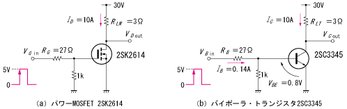 パワーMOSFETはパワー・トランジスタよりスイッチング速度が速い 一般的にパワーMOSFETはスイッチング速度が速いことが知られています.しかし同一条件で比較した場合のスピード差はあまり一般的に知られていません. 実験回路 そこで前出のパワー・トランジスタ2SC3345とパワーMOSFET 2SK2614を使って,スイッチング速度の比較をしてみます. 測定回路を図3に示します.この図からわかるとおり両者の測定条件はすべて同じです.