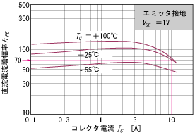 電源電圧と負荷電流 コレクタ電流IC とドレイン電流ID をともに10Aとします.また,2SC3345と2SK2614の負荷抵抗RLT とRLM をともに3Ωとします.電源電圧は30Vです. 駆動電圧 2SK2614のカタログを見るとロジック・レベル駆動(4V)を保証しているためVGin =5Vとします.2SC3345の駆動電圧VBin をこれに合わせて, VGin =VBin =5[V] とします. ベース抵抗RB 図4に示す2SC3345のhFE−IC 特性からIC =10Aにおける直流電流増幅率hFE を求めるとhFE =70と読み取れます.この値を使って2SC3345が十分飽和するベース電流IB を算出すると, IB ==0.14A となります.したがってベース抵抗RB は, RB ==28[Ω] ただし, VBE:ベース−エミッタ間電圧[V] と求まります.ここでVBE =1Vとしました. なお,実際の抵抗はE12系列から27Ωを選びました.ゲート抵抗RG も条件を合わせるために27Ωとします.