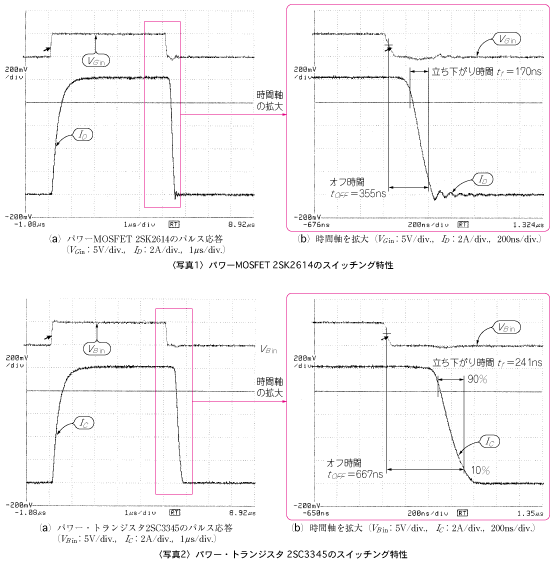明らかにパワーMOSFET 2SK2614のほうがパワー・トランジスタ2SC3345よりもスイッチング速度が速くなっています. 以下にそれぞれのターン・オフ時のスイッチング特性を示します. 立ち下がり時間tf パワーMOSFET 2SK2614:170ns パワー・トランジスタ2SC3345:241ns オフ遅延時間tOFF(=td(OFF)+tf) パワーMOSFET 2SK2614:355ns パワー・トランジスタ2SC3345:667ns Copyright 2000 トランジスタ技術編集部 編 |
