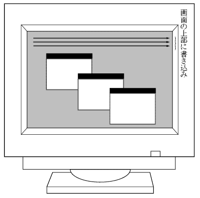 WindowsをVGAモードなどで使っていると,A0000H(セグメントアドレスA000H,オフセットアドレス0000H)からビデオ用のRAMが割り当てられています.このエリアに直接書き込みを行います. ● 変数の宣言 unsigned int loop ; WORD FAR * lpScreen ; WORD selector ; 上記は,何の変哲もない変数の宣言です. ● アドレスの代入