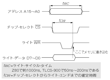 A14とMREQがアサートされ,74HC139のY1出力が“L”となり,RAMのチップ・セレクトCSがイネーブルになります. A2とA0が‘1’ですから,4000Hから始まるRAMの6番目のセルがアクセスされます. この状態で書き込みストローブ信号WRをアサートすることにより,メモリへの書き込みが実行されます. 図1-6にメモリ・ライト・サイクルのタイミング図を示します.メモリを選定するときの書き込み条件では,少なくともtWCとtCWの確認が必要です.
