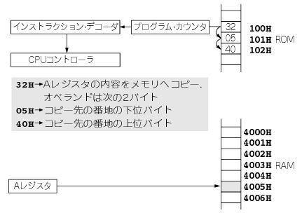 このメモリ・ライト・サイクルを行うニーモニックの記述例を次に示します. LD (4005H),A ;Aレジスタの値を ;4005番地へコピー 機械語では,32H,05H,40Hとなります.これがROM領域の100H番地に配置されたときの実行動作を図1-7に示します.
