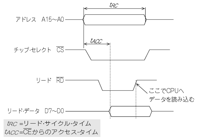 例2:I/Oの8001H番地から1バイトの読み出しを行 例1と同様にアドレス・バスが表1-2の状態で,74HC139のY2出力が“L”となり,I/Oのチップ・セレクトCSがイネーブルになります.