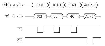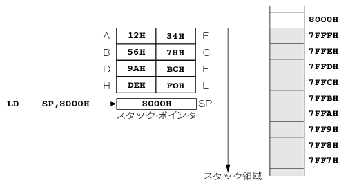 スタック・ポインタによるメモリ・アクセス 前述の例1と例2では,メモリ・アクセスを行うため,必ずアドレス指定を伴っていることにお気づきでしょうか.ただし,プログラム・カウンタによるROMのプログラム・リードは異なっています そのため,1バイトのメモリ操作が3バイト命令になっています(図1-8). もし,このアドレス指定が省略できたら命令が短くなり,実行速度も上がります.これを可能にするのがスタック・ポインタによるアドレス指定です. スタック操作は,スタック・ポインタで操作するアドレスを保持し,スタックへ書き込み(押し込み)したデータ数だけポインタ値を調整する手法です. スタックへのデータ格納命令(PUSH,CALLなど)を実行すると,スタック・ポインタが保持するアドレスは格納データ数だけ若くなり,逆にデータ取り出し命令(POP,RETなど)を実行するとそのデータ数だけポインタ値は大きくなります. スタック操作の具体例 スタック操作を行うためには,あらかじめスタック・ポインタにスタック領域の先頭番地+1番地の値を設定します. 次の例の場合,7FFFH番地以下をスタック領域とするので, LD SP,8000H ;スタック・ポインタに ;8000Hを設定 を実行します. スタックは,サブルーチン・コール時の戻り番地のメモなどにも使われますから,通常のCPUの起動直後に,この命令を実行します. 図1-10に,スタック操作の具体例を説明します.