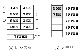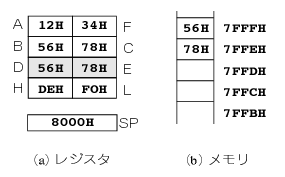 を実行すると,スタック・ポインタ値が1番地下がり(7FFFH),その番地へBレジスタの内容がコピーされます.次に,スタック・ポインタ値がもう1番地下がり(7FFEH),その番地へCレジスタの内容がコピーされます. その結果,図1-11のように,7FFFH番地は56H,7FFEH番地は78Hとなります.スタック・ポインタ値は7FFEHです.