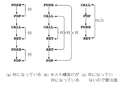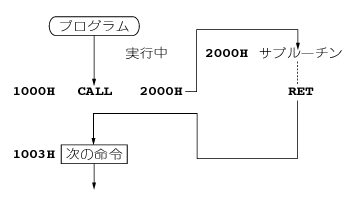 CALL命令が実行されるとスタック7FFFHに戻り番地の上位バイト10Hを,7FFEHに下位バイト03Hを入れ,スタック・ポインタは7FFEHとなります.その後プログラム・カウンタに2000Hを書き込み,2000H番地へジャンプします. サブルーチン内で RET命令が実行されるとスタックされていた戻り番地1003Hをプログラム・カウンタにコピーし,スタック・ポインタ値を2番地戻して8000Hとします. これでサブルーチン・コール前の状態になります. スタック使用時の注意事項 スタックを使用する命令のPUSHとPOPまたはCALLとRETは一対の命令です. ネスティングは構いませんが,図1-14のように順序を誤るとプログラムは暴走します.