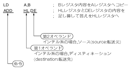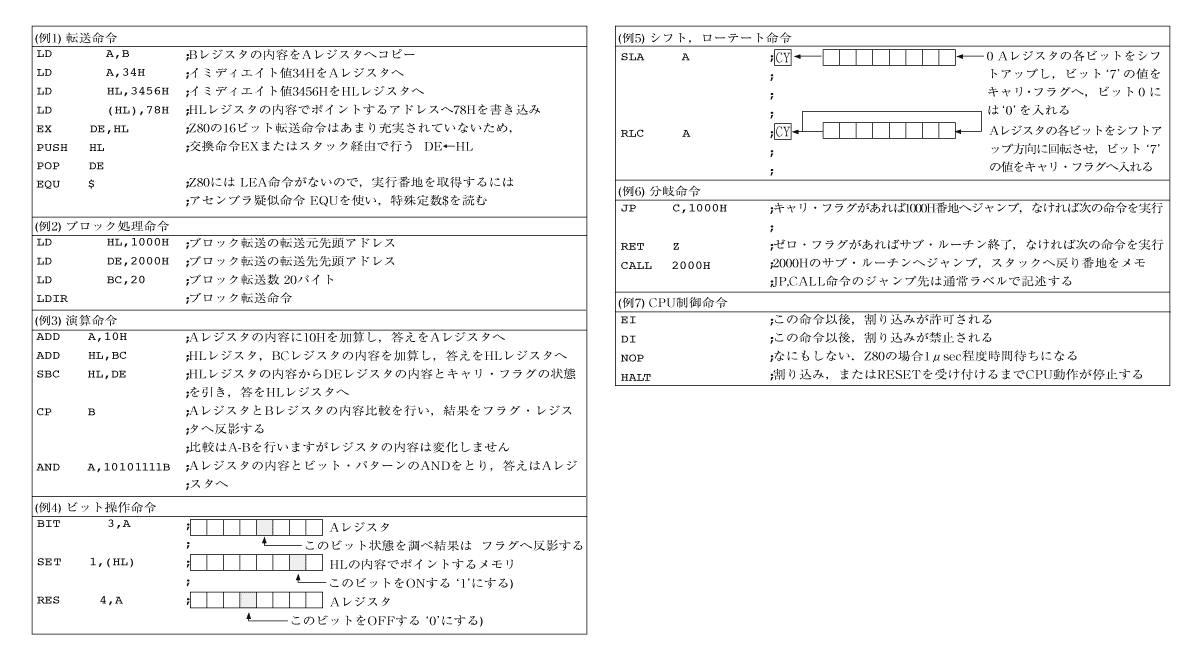 なお,インテル系(Z80,8086,TLCS-900など)とモトローラ系(68000,H8など)では,ソースとディスティネーションの並びが逆になりますので,注意が必要です. アドレッシングの方法 アドレッシングとは,オペランドで指定するデータまたはデータのある場所を示す方法のことです. アドレッシング方法は,CPUにより若干異なりますが,次の5種類に大別され,その組み合わせでプログラムを記述します レジスタ・モードの例 LD A,B レジスタA,レジスタBなどのように,直接レジスタ名を指定します.アドレッシングに要するクロック数が一番少ない,もっとも効率の良いモードです. イミディエイト・モードの例 LD A,12H イミディエイト・データ12Hが直接コードになります. この例の第1オペランドはレジスタ・モードで,第2オペランドがイミディエイト・モードです. 直接番地指定モードの例 (1) LD (1000H),A (2) JR mn ;mnは通常ラベルを使用する (3) JP 2000H 操作対象となるアドレスを直接,絶対値または相対値で指定します. レジスタ間接モードの例 LD HL,1000H ;HLレジスタに1000H ;をロード LD (HL),12H ;HLレジスタの内容で ;間接指定される1000H ;番地へ12Hをストア 1行目はレジスタ・モードとイミディエイト・モード,2行目の(HL)が間接モードです. インデックス間接モードの例 LD (IX+34H),A レジスタ間接モードとよく似ていますが,インデックス間接モードの場合,ベース指定されたインデックス・レジスタの内容に,ディスプレースメント値が加算された値のメモリ番地が操作対象となります. 命令とアドレッシングの組み合わせ例 いろいろな命令とアドレッシング・モードがソース,ディスティネーションを問わずに自由に組み合わせ可能なCPUが使いやすいCPUです. しかし,Z80の命令体系はAレジスタ,HLレジスタを中心に構成していますから,あまり使いやすいCPUとはいえません. リスト1-1は,Z80の各種命令とアドレッシングの組み合わせ例です.