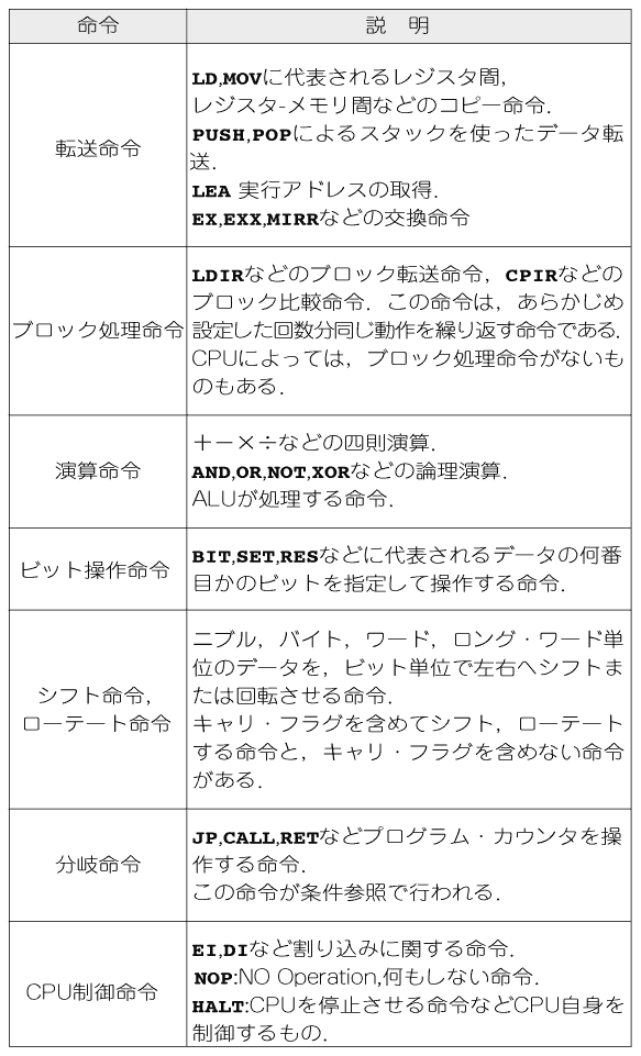 制御用CPUの命令 少し話がそれましたが,ここでは制御用CPUがもっている命令を種類別に説明します.説明では,Z80のニーモニックを主に使用します. 表1-3に,マイクロコンピュータの命令大別表を示します.