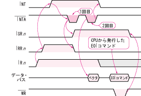ICW1 ICW1のビット7〜5,2は8080/8085モードのときだけ有効なので,PCの場合は意味をもちません.簡単のため“0”にしておくのがよいでしょう. ICW1のビット1はPICが単独で使われている場合は“1”に,複数のPICをカスケード接続している場合は“0”にしますが,PCの場合は2個のPICをカスケードにしているので,常に“1”となります. ICW1のビット0を“0”にすると,ICW4はデフォルト値となり,8080/8085モードになってしまうので,PCでは“1”にして,ICWで8086モードに設定しなくてはなりません. ICW1ビット3はPICの割り込み入力をレベル・トリガで使うか,エッジ・トリガ・モードで使うかを指定しますが,各入力ごとではなくチップ全体の一括設定しかできません. レベル・トリガの場合は割り込み入力が“H”レベルであるかぎり何度でも割り込み要求が発生しますが,エッジ・トリガの場合は“L”から“H”への変化があったときに割り込みとなります.PCの場合にはエッジ・トリガ・モードで使用します. 少し注意が必要なのは,エッジ・トリガ入力の場合でも,割り込み要求が受け付けられる(ISRにセットされる)までの間は“H”レベルを維持しなくてはならないということです.CPUがINTAを返したときにIR入力を“L”レベルにしてしまうと,「不完全割り込み」の扱いになります. 不完全割り込みの場合,PICはIR7に相当するベクタ番号を出力します.このときISRには新たなビットはセットされないので,ソフトウェアではIR7の割り込みを受けた場合,念のためにISRを見て「不完全割り込み」ではないことを確認しておいたほうがよいでしょう. ICW2 ICW2は割り込みベクタのベース・アドレスを指定します.80x86のハードウェア割り込みベクタは8ビットありますが,このうち上位5ビットを設定します.下位3ビットは,割り込み要因番号がそのまま使われます. たとえば,ICW2に20hを設定しているときにIR3の割り込みが発生したとき,割り込みベクタは23hが出力されます. ICW3 マスタとスレーブのPICでは設定値の意味が異なります.マスタPICの場合,ビット7〜0がそれぞれIR7〜IR0に対応しており,該当する入力にスレーブPICがつながっているときは“1”を,スレーブPICが接続されていないときは“0”を設定します.PCではマスタPICのIR2にスレーブPICがつながっているので,設定値は04hとなります. スレーブPICの場合は,自身がマスタの何番のIRに接続されているかを設定します.PCのスレーブPICはマスタのIR2につながっていますから,02hを設定します. ICW4 ビット3〜2は大規模システムでPICの出力にバッファを付ける必要がある場合に設定しますが,PCではノン・バッファ・モードで使っているのでビット3は“0”にします. PC/ATの場合,後述しますがバッファ・モードにプログラムするとPICを壊す恐れがあります.現在のチップ・セットに吸収されたPICの場合,この機能自体が削除されているでしょうから,間違ってもだいじょうぶと思われますが,念のためプログラムを確認しておいたほうがよいでしょう. ICW4のビット0は,8080/8085モードでは“0”,8086モードでは“1”とします.PCではもちろん“1”です. ビット1はEOI(エンド・オブ・インタラプト)モードの設定です.EOIというのはCPUが割り込みを受け付けた後,PICに対して割り込み処理が完了したことを示すものです.図3のようにPICはEOIを受けると,ISRの対象ビットを“0”にします.ISRが“1”になっていると,その割り込みを新たに受け付けることはできないのですが,“0”になると再び受け付け可能な状態となります.