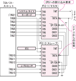 割り込みコントローラ(8259A) PCの割り込みコントローラ(PIC:プログラマブル・インタラプト・コントローラ)にはIntelの8259A相当品が二つ使われています.8259Aは8ビットCPU,8080用の割り込みコントローラとして作られた8259に8086対応機能を付加したものです.現在のPCでは8259Aそのものが使われているわけではなく,あくまでもPC専用に設計された互換コアです.このため,現在のチップ・セットに入っているPICには8259Aの全機能が備わっているわけではありませんし,PCI割り込み対応などで若干の拡張が行われていることもあります. たとえば,8259Aには8080/8085動作モードもありますが,PCで設定しても動かずまったく意味もないので,設定できないと思っておくべきです.また,PICの割り込み入力はエッジやレベルの設定ができるのですが,PCではエッジしか使用しませんから,レベル設定はできないのがふつうです. 実際,IntelのPCI/ISAブリッジ・チップ(P2X4)に内蔵のPICでは,このエッジ/レベル選択機能が削られています.逆にPCIバスは割り込みをレベルで取るため,P2X4では各割り込み入力ごとにエッジ/レベル選択ができるレジスタを追加しています. この他のデバイスに関しても,通常PCで使われない設定については「設定できない」と考えたほうが無難です. PCの割り込みコントローラ接続 PCの割り込みコントローラは図1のように,PIC1(マスタPIC)のIR2にPIC2(スレーブPIC)がカスケード接続された形になっています.