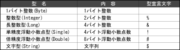 なお,Scaleメソッドを用いると座標系を変更することができ,直接デカルト座標値で描画することが可能です. 変数の宣言について Dimステートメントは,変数の宣言ステートメントです.プロシージャ内で用いた場合は,そのプロシージャだけで有効な変数です.宣言セクションでDimまたはPrivateステートメントで宣言すると,フォームモジュール内のどこからでも使用できるようになります.これに対し,標準モジュール宣言セクションにおいてPublicステートメントで宣言した変数は,すべてのモジュールのどこからでも使用できます. 変数の型を指定するには,変数名の後にAs Singleのように指定します.1行に複数の変数を宣言する場合も変数ごとに型を指定します.これを省略するとバリアント型として解釈されるので注意しましょう. 型の指定には型宣言文字を用いることができます.例えば,x0 As Singleを x0! のように宣言することができます.主な型名と型宣言文字を表1.1に示します.なお,型宣言文字は配列宣言のときには使えません.