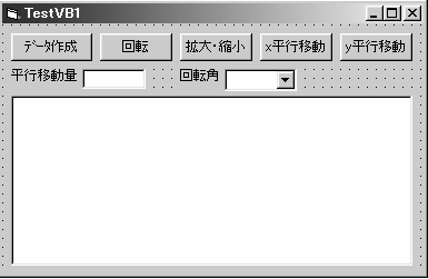 ラベルの表示文字をCaptionプロパティで,それぞれ“平行移動量”,“回転角"に変更します.テキストボックスの(オブジェクト名)を“txtTranslate”,コンボボックスの(オブジェクト名)を“cmbRotation”とします.表示されているテキストが目障りなときは,Textプロパティを空白にします.これで準備完了です. フォームモジュールの宣言セクションに, Dim trans As Single '平行移動量 Dim angle As Single '回転角 を追加します.Form_Loadイベント,cmdRotate_MouseDownイベントおよびcmdTranslateX_MouseDownイベントを変更します.また,新たにtxtTranslate_ChangeイベントおよびcmbRotation_Clickイベントを追加します.これらをリスト1.13に示します.
