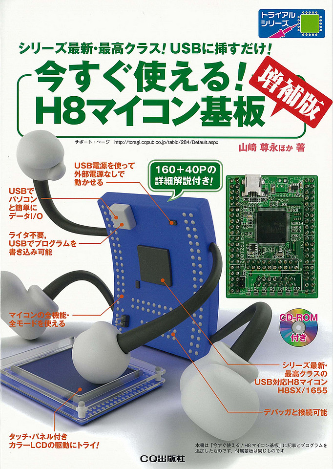 H8マイコンの最新版・高性能版搭載のマイコン・ボードを開発しました.H8は,月刊トランジスタ技術2004年4月号 付属基板 特集で好評をいただいた超定番マイコンです.本書に付属するマイコン基板は,シリーズ最新・最高クラスのH8マイコン(H8SX/1655)を搭載しており,USBに挿すだけですぐに試せます.開発に必要なツールやサンプル・プログラムも付属CD-ROMに収録しています.160ページの詳しい解説付きで,この1冊で,本格的な組み込みマイコン開発技術を始めることができます.同時に,(1)スタートアップ用と(2)カラーLCD制御用の二つの拡張基板(別売)も開発しました.本書では,基本的なプログラミング技術だけでなく,カラー液晶ディスプレイへの画像の表示方法や,タッチ・パネル入力などの応用プログラミングを学習できます.