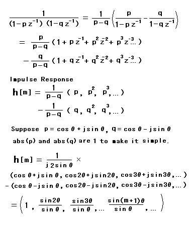 極が複素数の場合インパルス応答は基本的に振動しますが、その周波数は実数部が正のときは低く、負のときは高くなります。下の式においてp、qは極でその絶対値は1と仮定します。θはpの複素平面上での角度です。