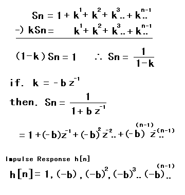 下の式において、bの絶対値が1.0以上の場合、インパルス応答、h[n]は無限大に向かっていくことが分かる。インパルス応答が