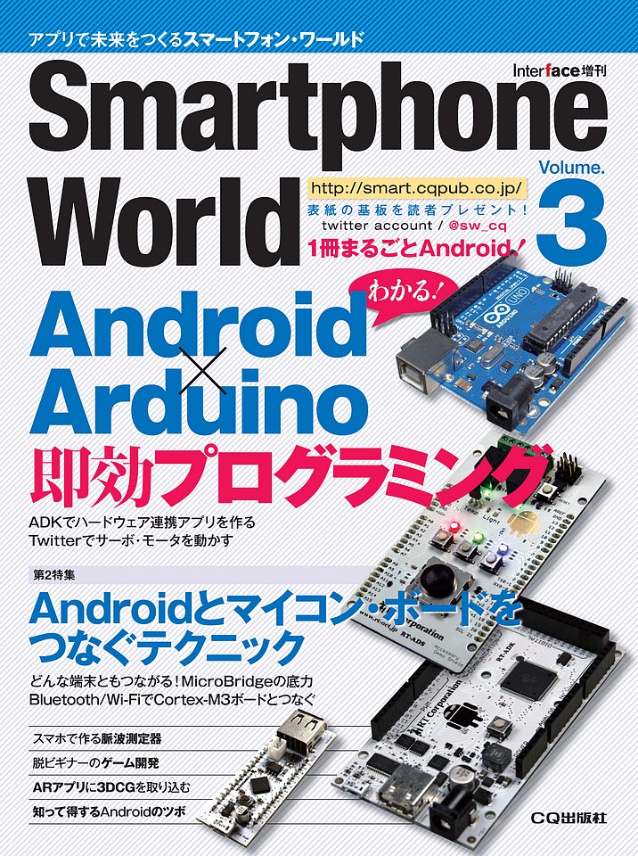 「Smartphone World」Volume.3では,外部のハードウェア,特に「Arduino」とAndroidスマートフォンをつなげる方法にフォーカスします.モータやLEDなどをArduinoと連携してアプリ側から操作するためのプログラミングや,Android端末とマイコンをBluetoothやWi-Fiでつなぐ開発方法を解説します.ゲームのプログラミングを通してアプリ開発の初歩を理解する記事など,初心者向け記事も充実しています.