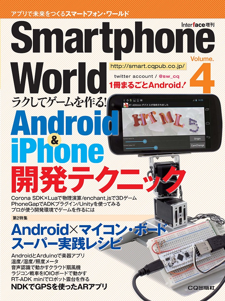 また,第2特集として,本誌Vol.3で好評だったAndroid+Arduinoアプリのレシピを紹介します。楽器や温度/湿度/照度計,クラウド扇風機などのアプリや,ラジコンアプリ,カメラ雲台などを徹底解説します.