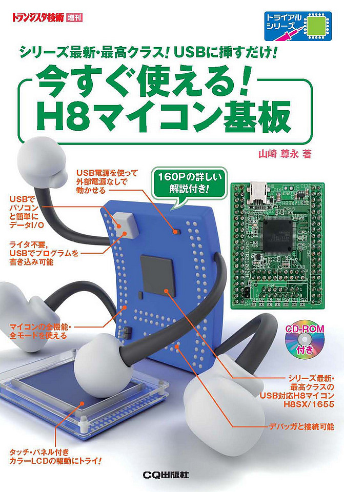 H8マイコンの最新版・高性能版搭載のマイコン・ボードを開発しました.H8は,月刊トランジスタ技術2004年4月号 付属基板 特集で好評をいただいた超定番マイコンです.本書に付属するマイコン基板は,シリーズ最新・最高クラスのH8マイコン(H8SX/1655)を搭載しており,USBに挿すだけですぐに試せます.開発に必要なツールやサンプル・プログラムも付属CD-ROMに収録しています.160ページの詳しい解説付きで,この1冊で,本格的な組み込みマイコン開発技術を始めることができます.同時に,(1)スタートアップ用と(2)カラーLCD制御用の二つの拡張基板(別売)も開発しました.